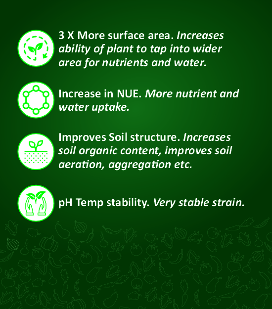- 3X more root surface area through hyphal extension, improving soil exploration.